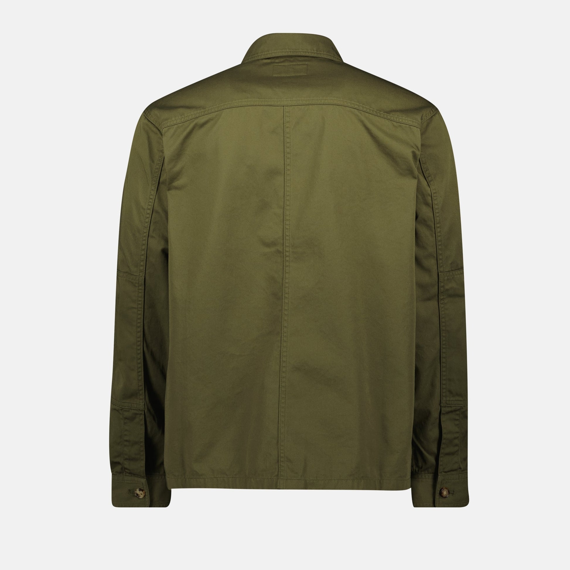 Kaki green cotton overshirt by Saint Laurent for men, from the Spring-Summer 2025 collection. It features a classic collar, long sleeves, and an elegant straight cut.