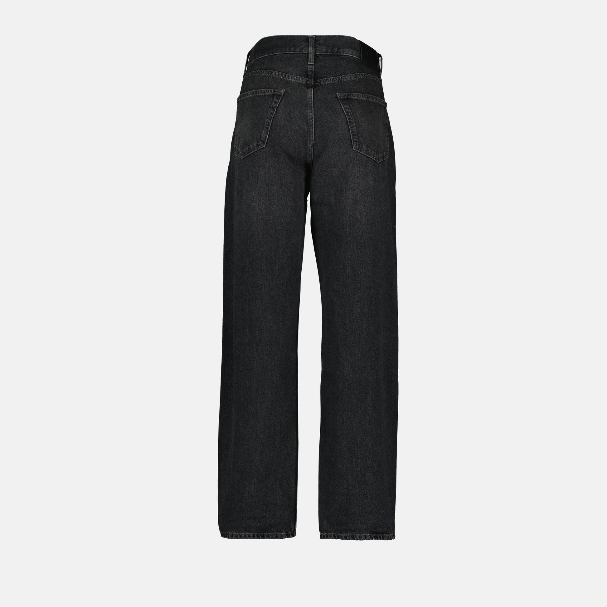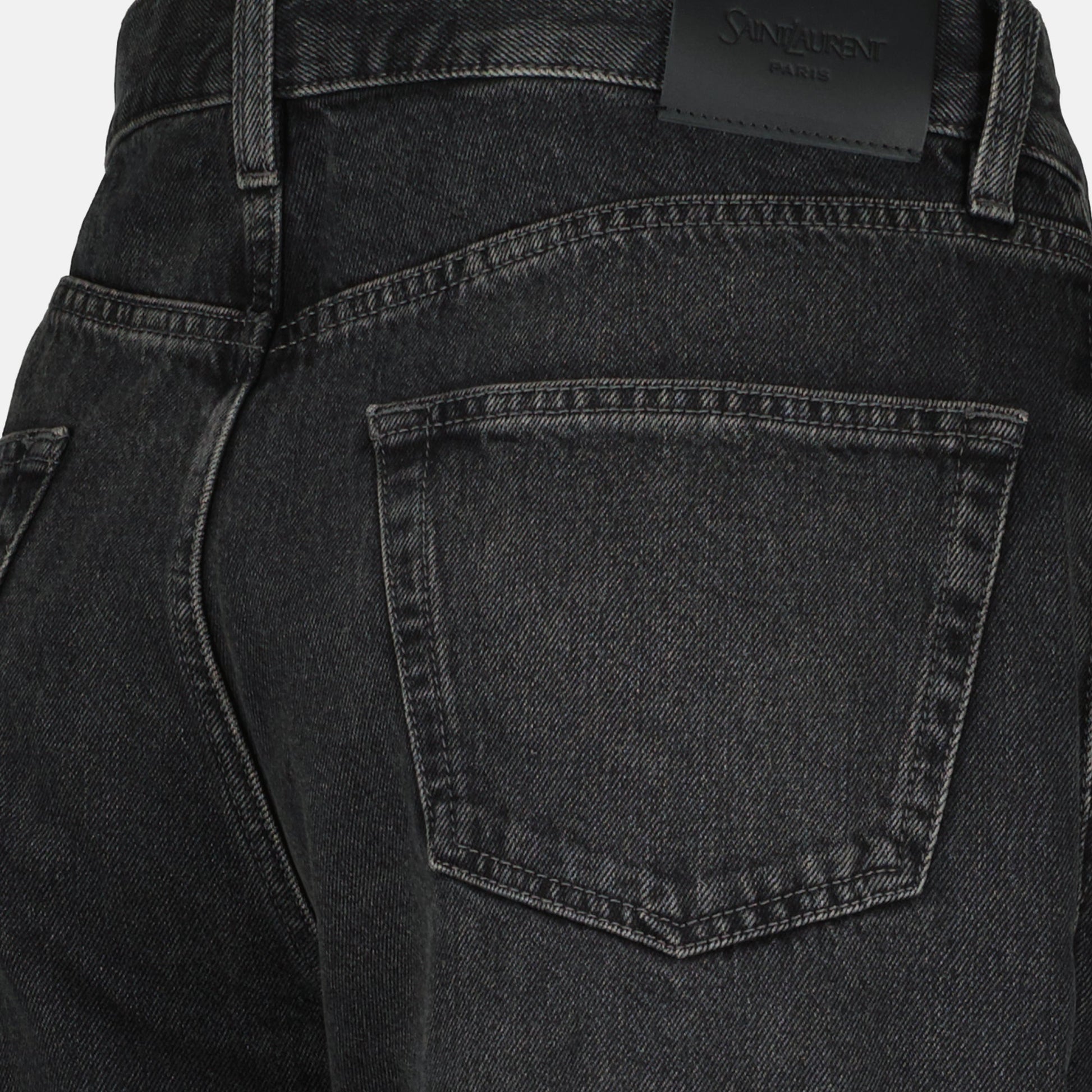 The Westwood denim jean from Saint Laurent is a women's model from the Autumn-Winter 2025 collection. It features a straight fit, a leather logo patch, and a faded black color.