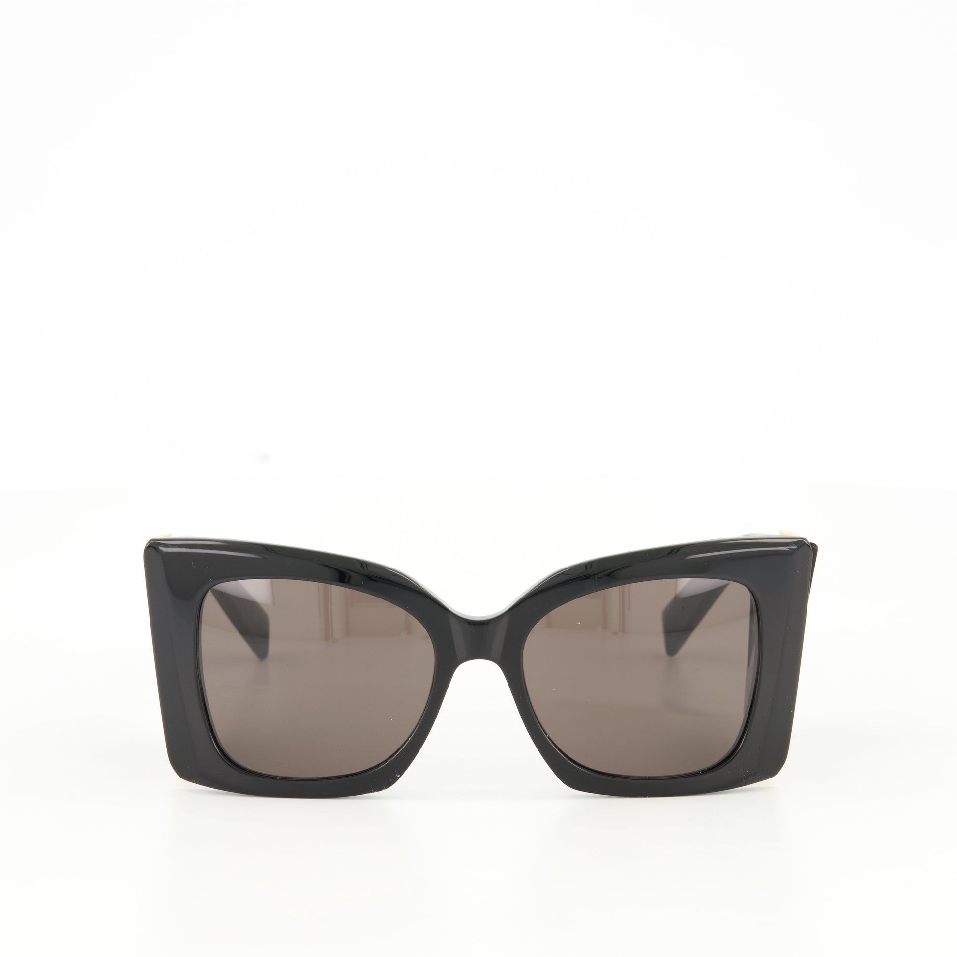 The SL M119 heart sunglasses from Saint Laurent are a unisex model from the Fall-Winter 2024 collection. They feature oversized Cat-Eye frames made of black acetate with a gold logo.