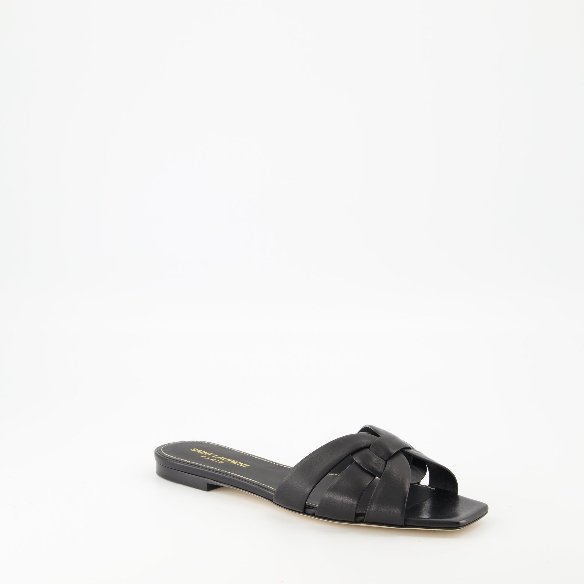 The black Tribute Mules from Saint Laurent are women's shoes from the Spring-Summer 2025 collection. They feature a slip-on design with a square open toe made of calf leather.