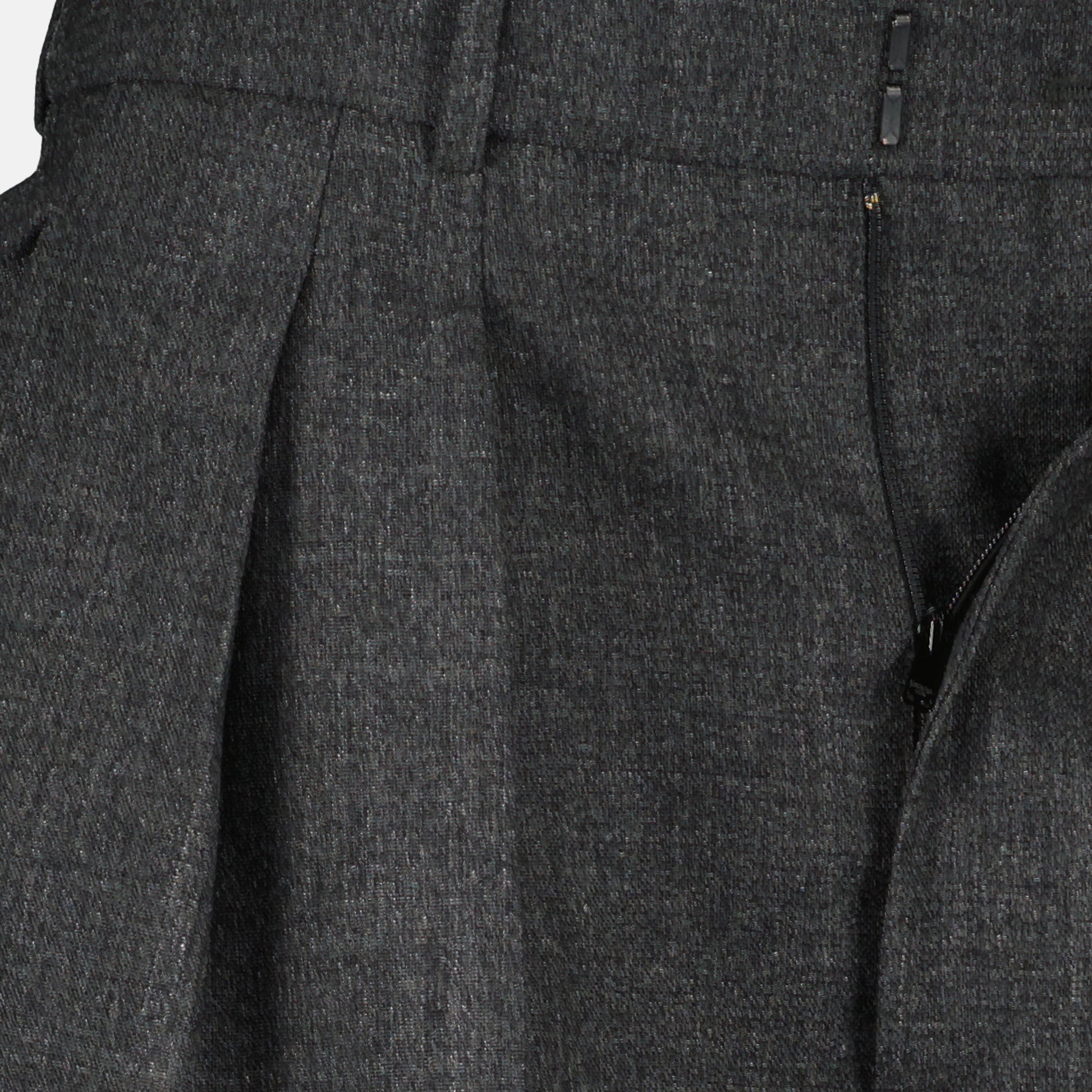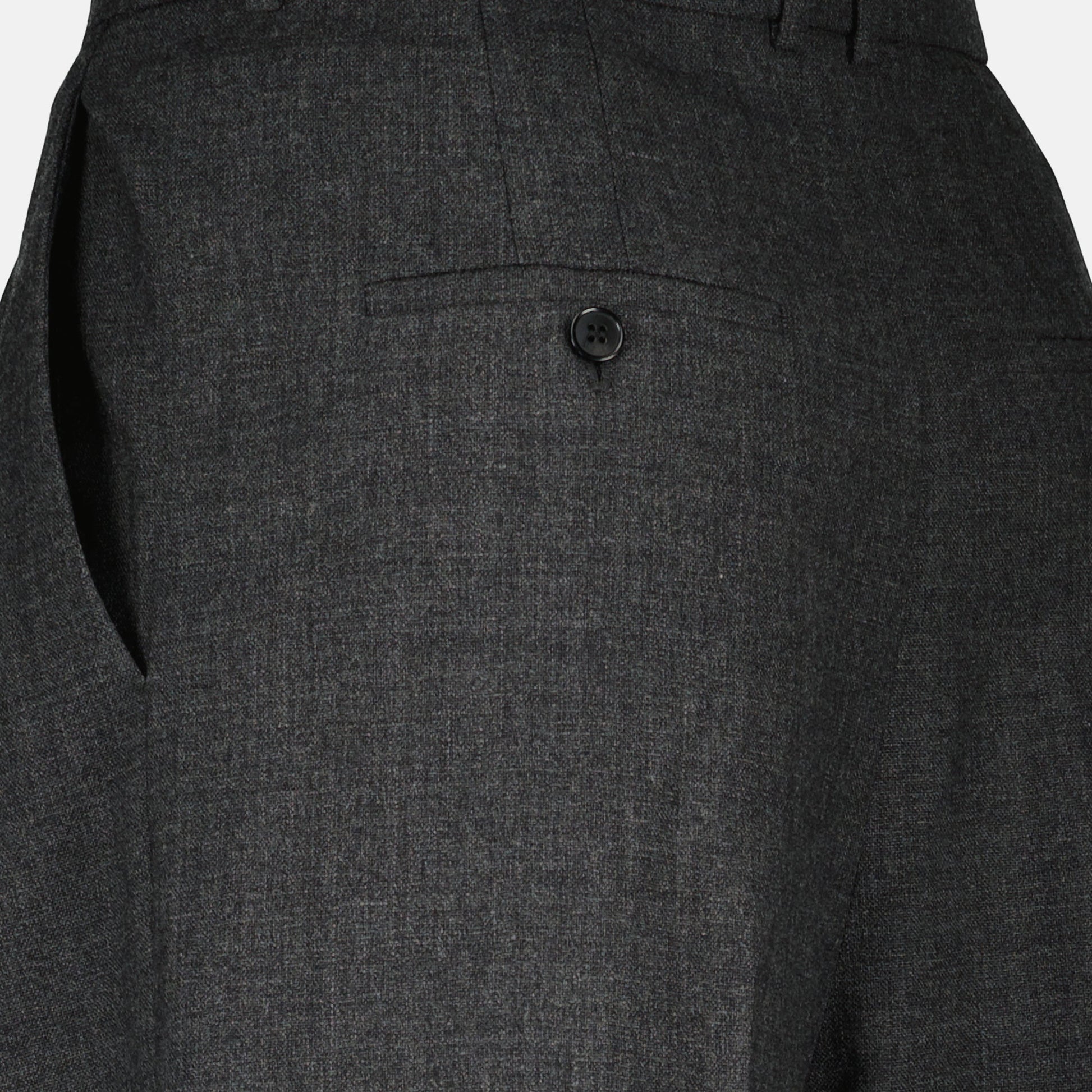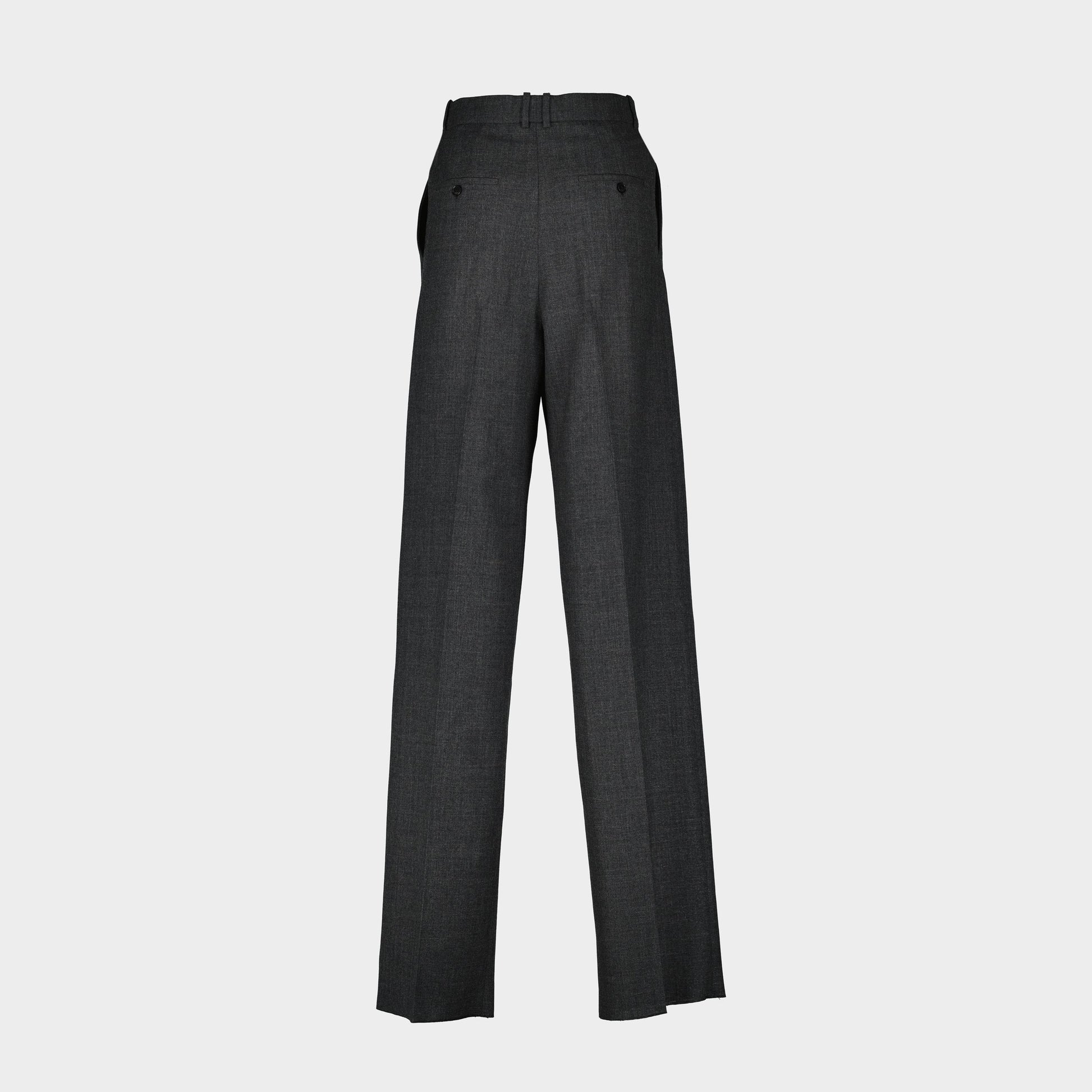Gray wool pants by Saint Laurent for women. This model is part of the Spring-Summer 2025 collection featuring a wide cut and elegant details.