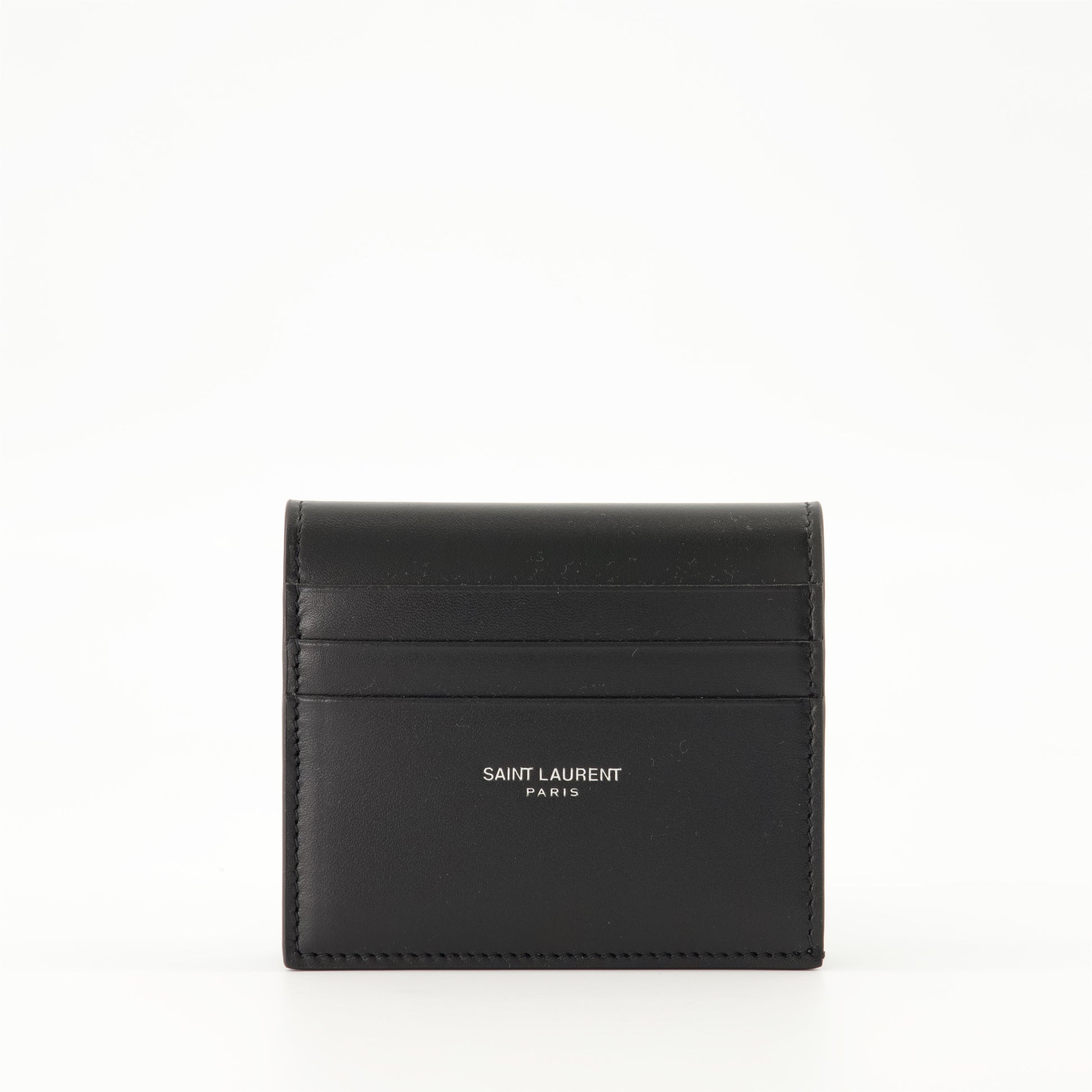 Reversible cardholder in smooth leather from Saint Laurent, designed for men. This model is part of the Spring-Summer 2025 collection and is available in black with a laminated logo.