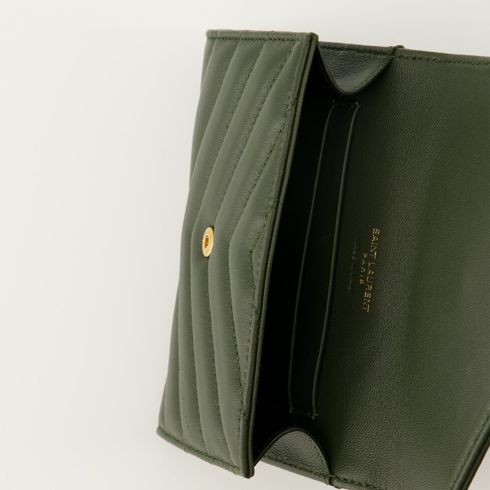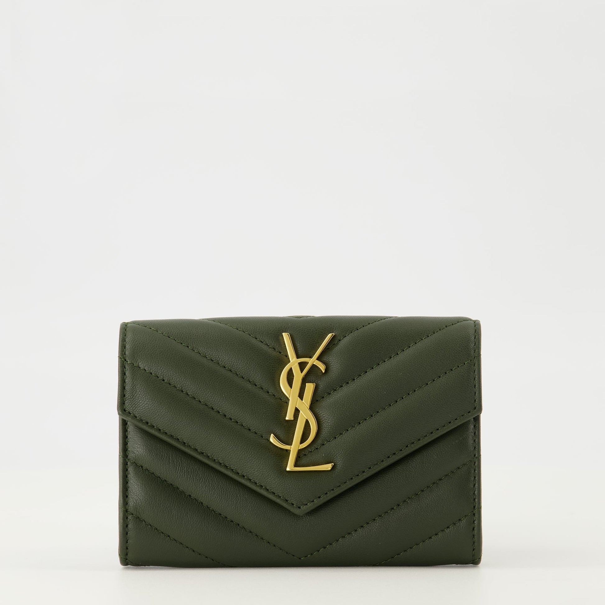 Le portefeuille Cassandre kaki de Saint Laurent est un accessoire féminin réalisé en cuir d'agneau. Il fait partie de la collection Automne-Hiver 2025 et présente des détails dorés élégants.