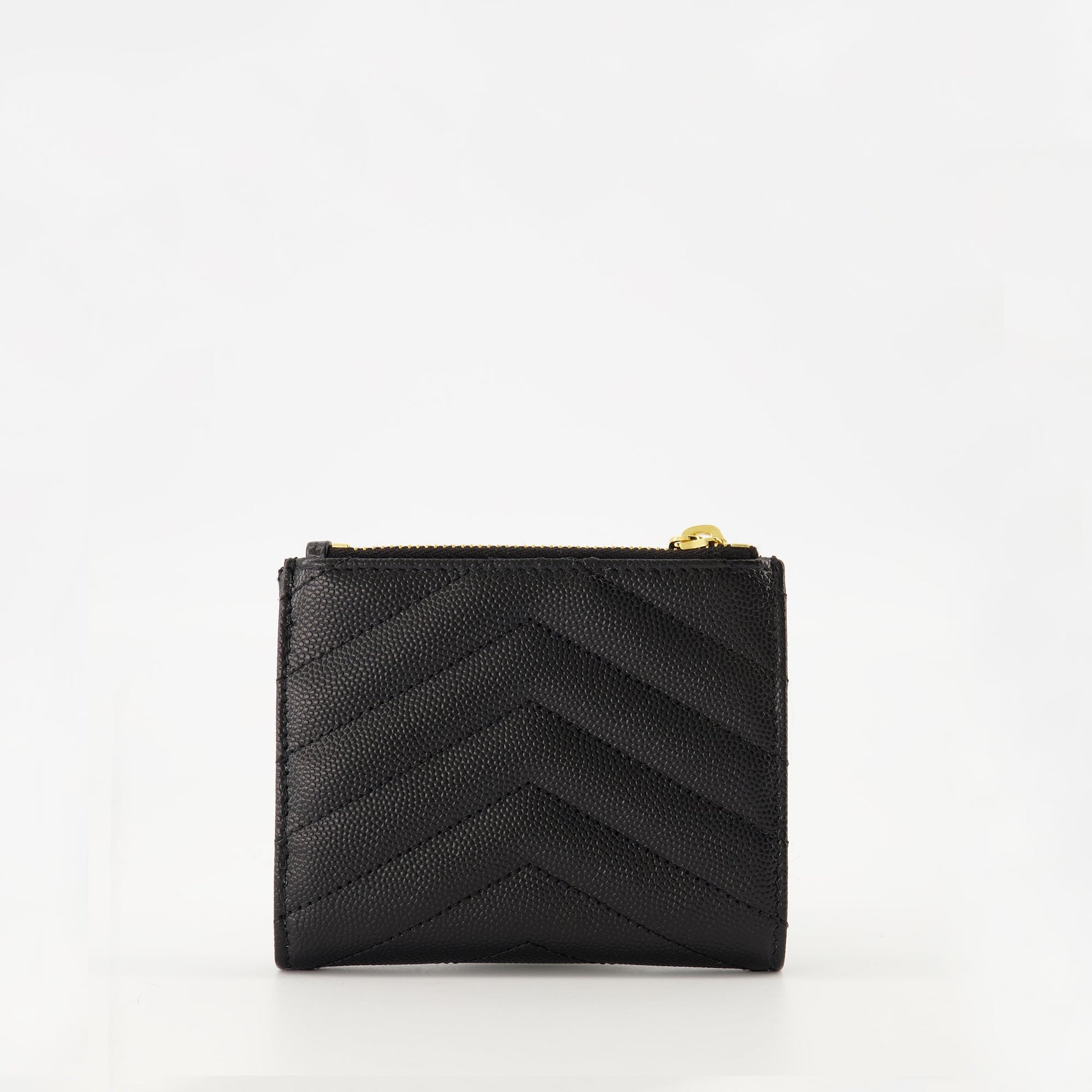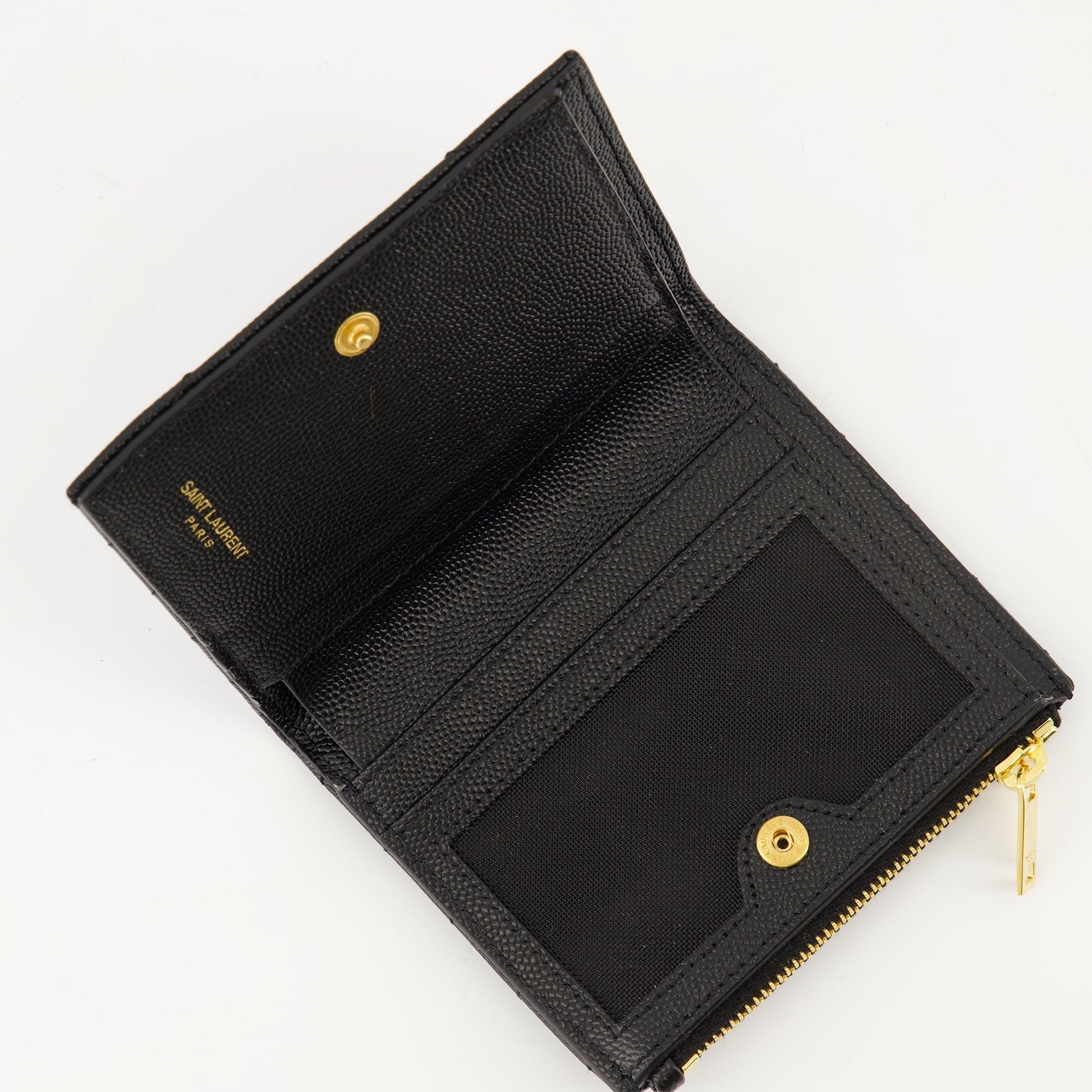 The black Cassandre wallet from Saint Laurent is an elegant women's accessory, crafted from grained calf leather. It is part of the Autumn-Winter 2025 collection and features a square design.