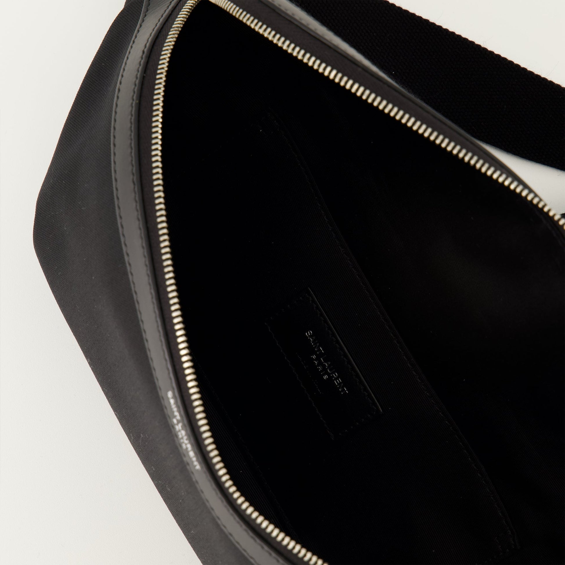 The black canvas and leather bum bag from Saint Laurent is a men's accessory from the Autumn-Winter 2025 collection. It combines elegance and practicality with its multiple pockets and refined finishes.