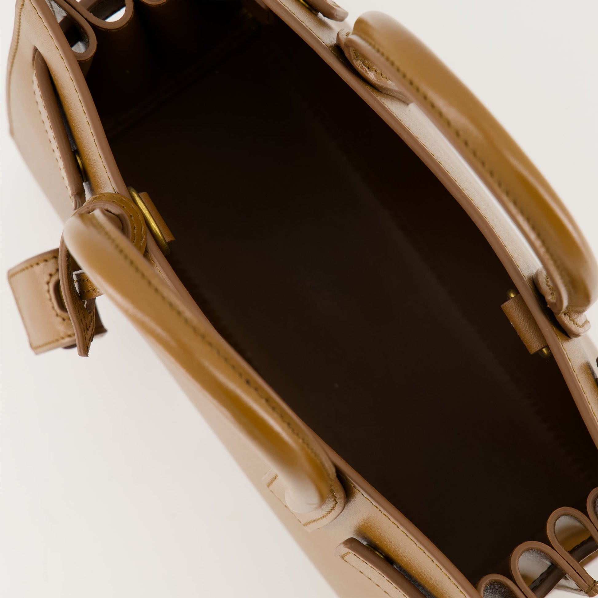 The brown nano day bag from Saint Laurent is an elegant accessory for women. Part of the Autumn-Winter 2025 collection, it combines calfskin leather with golden brass finishes.