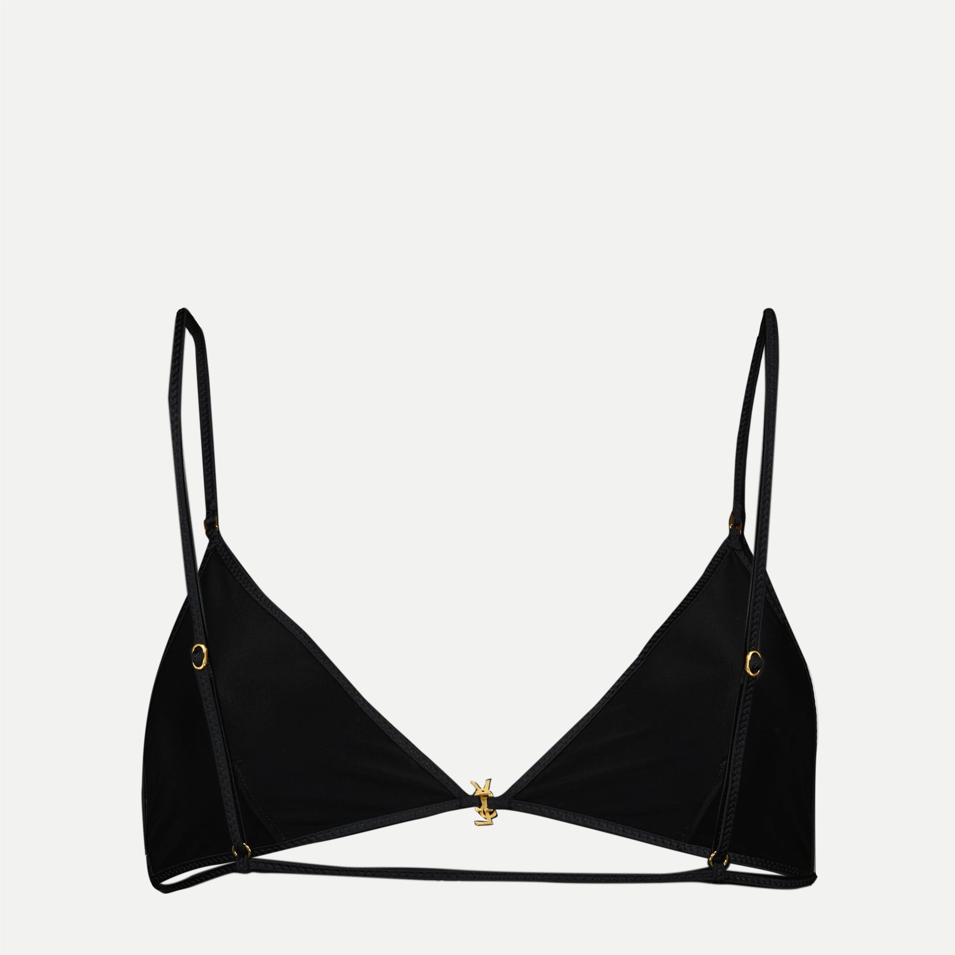 The black triangle bra from Saint Laurent is a women's item from the Spring-Summer 2025 collection. It is made of viscose and elastane with adjustable straps and a metallic logo.