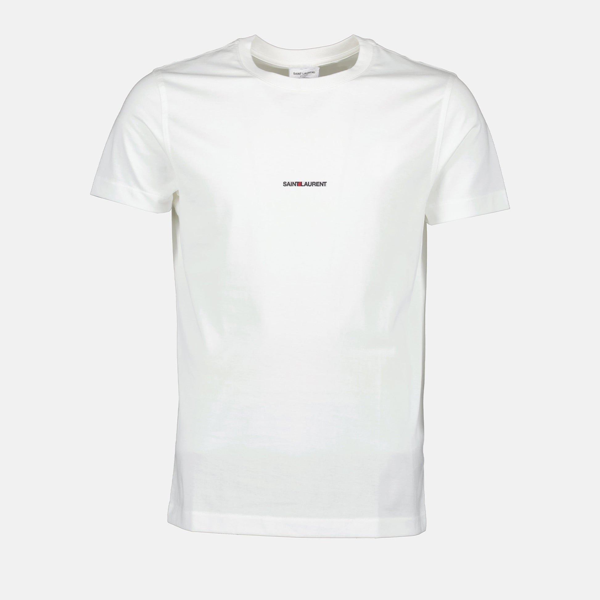Classic white logo T-shirt from Saint Laurent for men. This model is part of the Fall-Winter 2024 collection and is made from cotton with an embroidered logo on the front.
