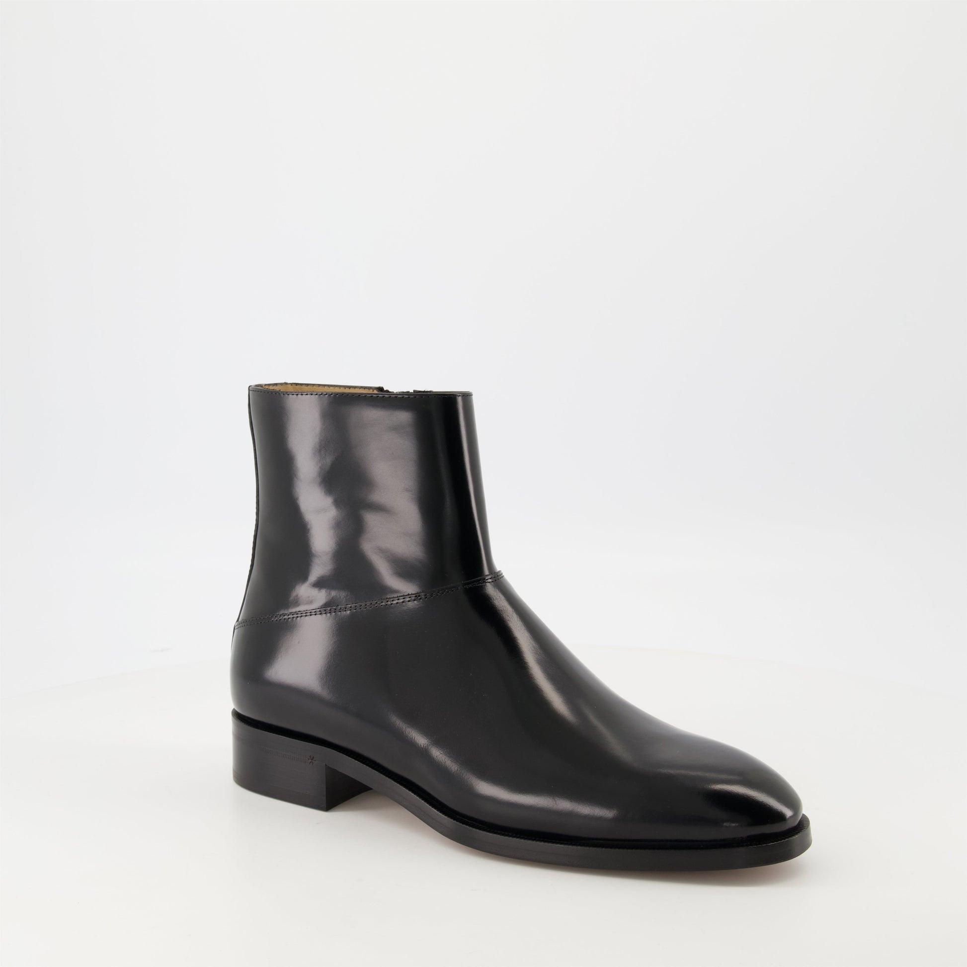 Pat leather ankle boots in black by Valentino Garavani for men. This pair is part of the Spring-Summer 2025 collection and stands out with its shiny leather and VLogo Signature.