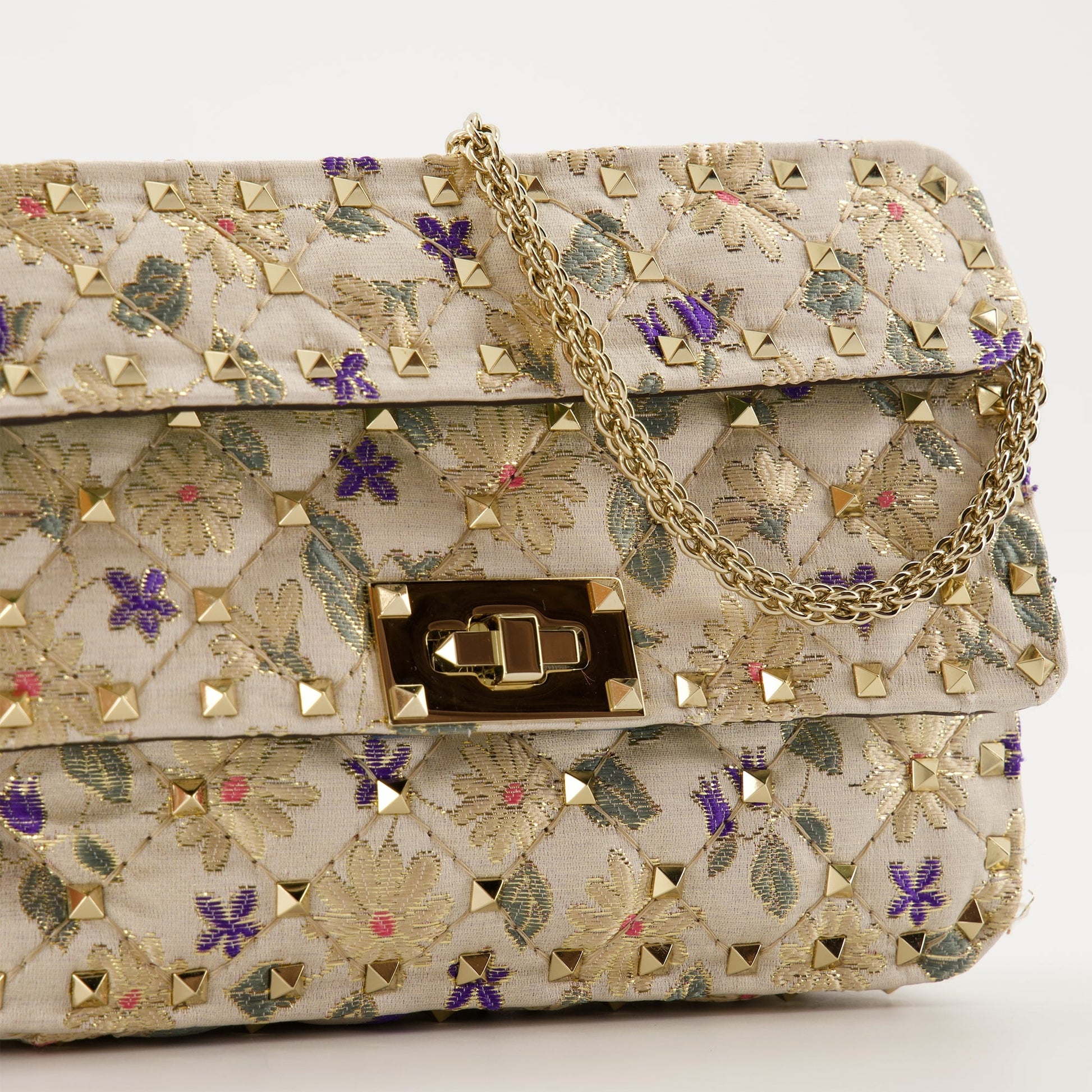 The Rockstud Spike small bag by Valentino Garavani is an elegant accessory for women. It is part of the Autumn-Winter 2025 collection, combining leather and jacquard fabric.