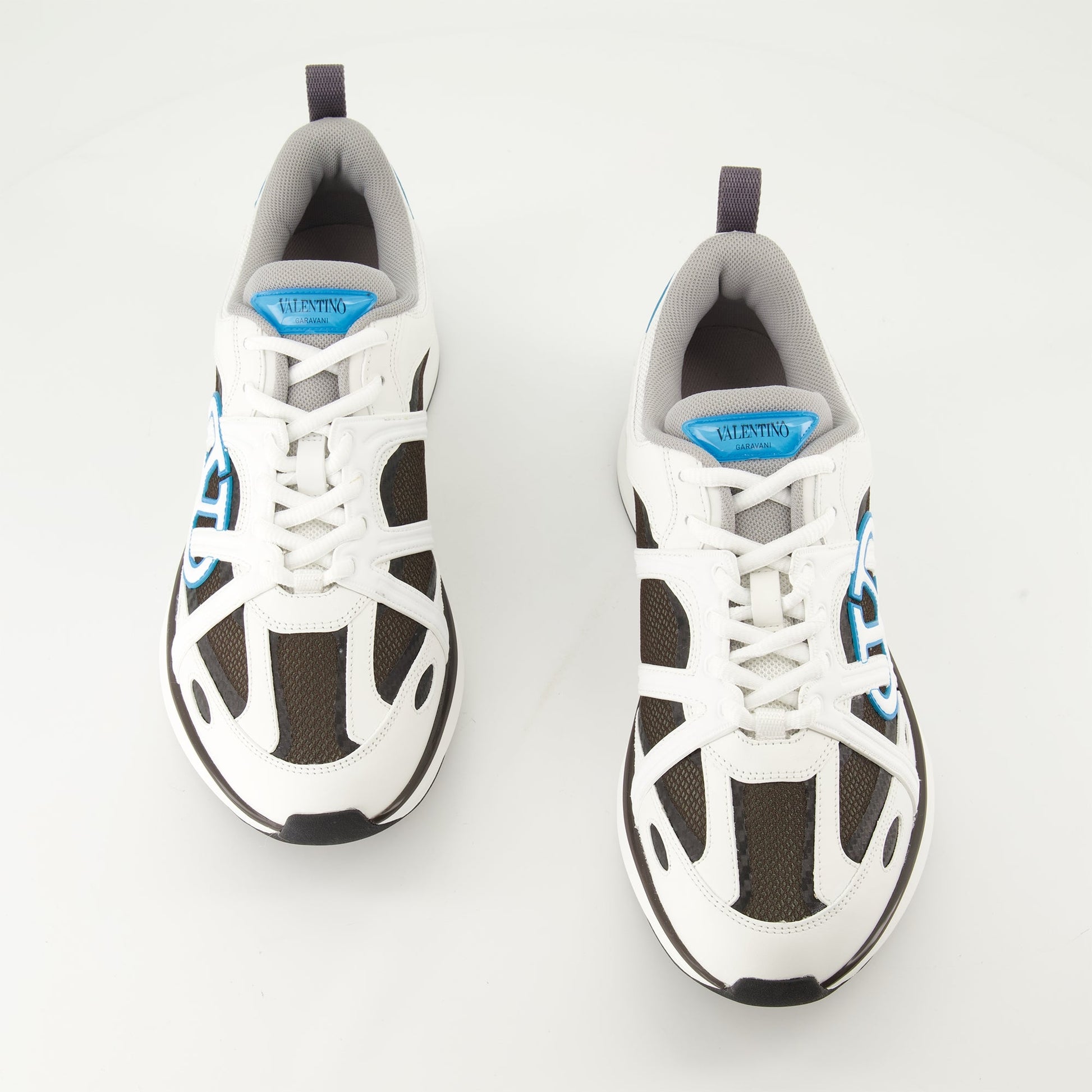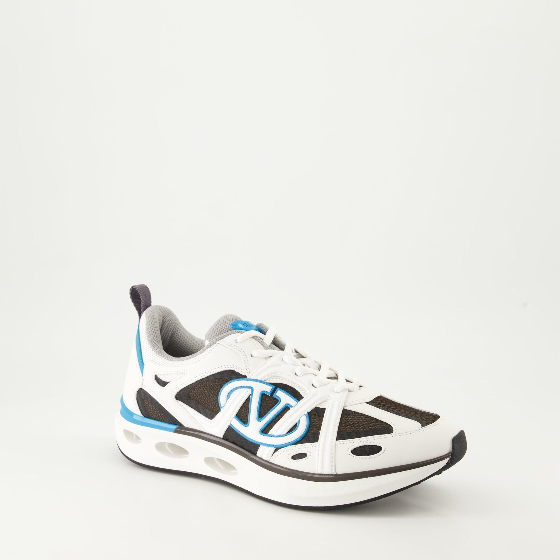 VLogo Easyjog Sneakers from Valentino Garavani's Autumn-Winter 2024 collection for Men. Made of leather and mesh. Designed in a tricolor scheme of white, black, and blue. Almond-shaped toe and rubber tread sole. This item is available in multiple variations.