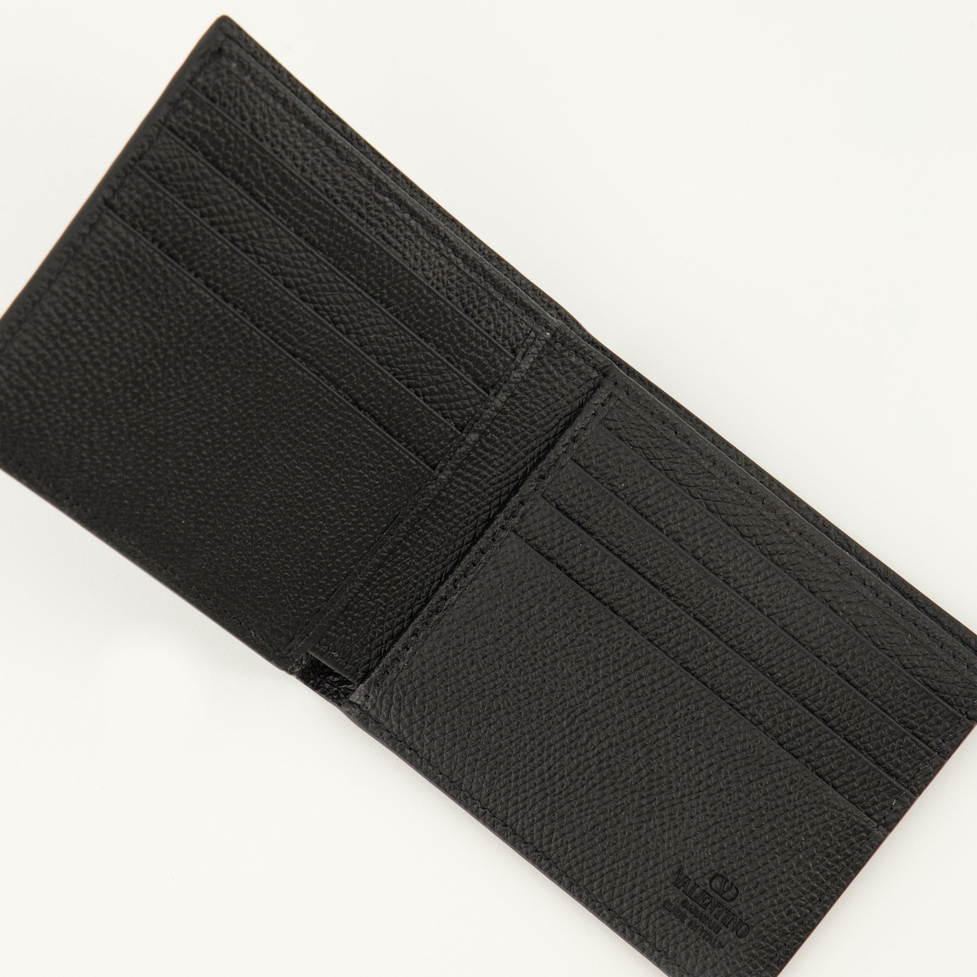 The black VLogo wallet by Valentino Garavani is a men's accessory from the Autumn-Winter 2025 collection. It is made from grained calf leather and features an elegant square design.