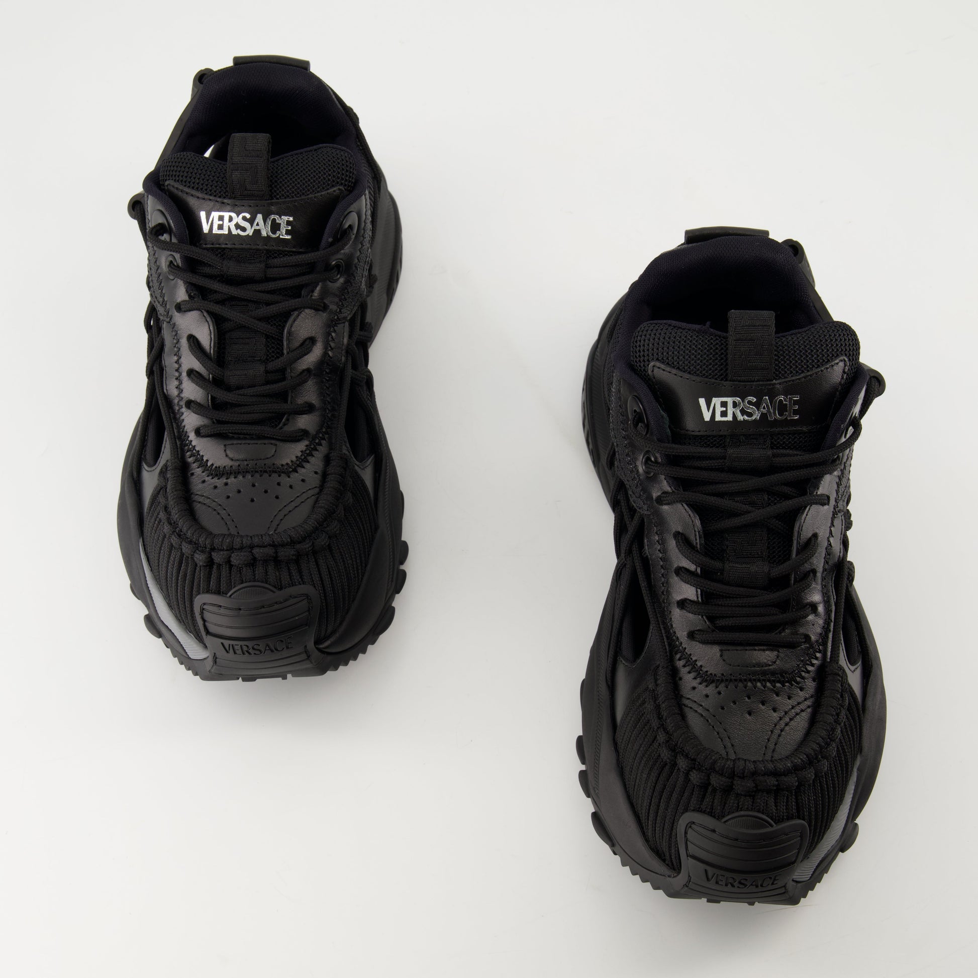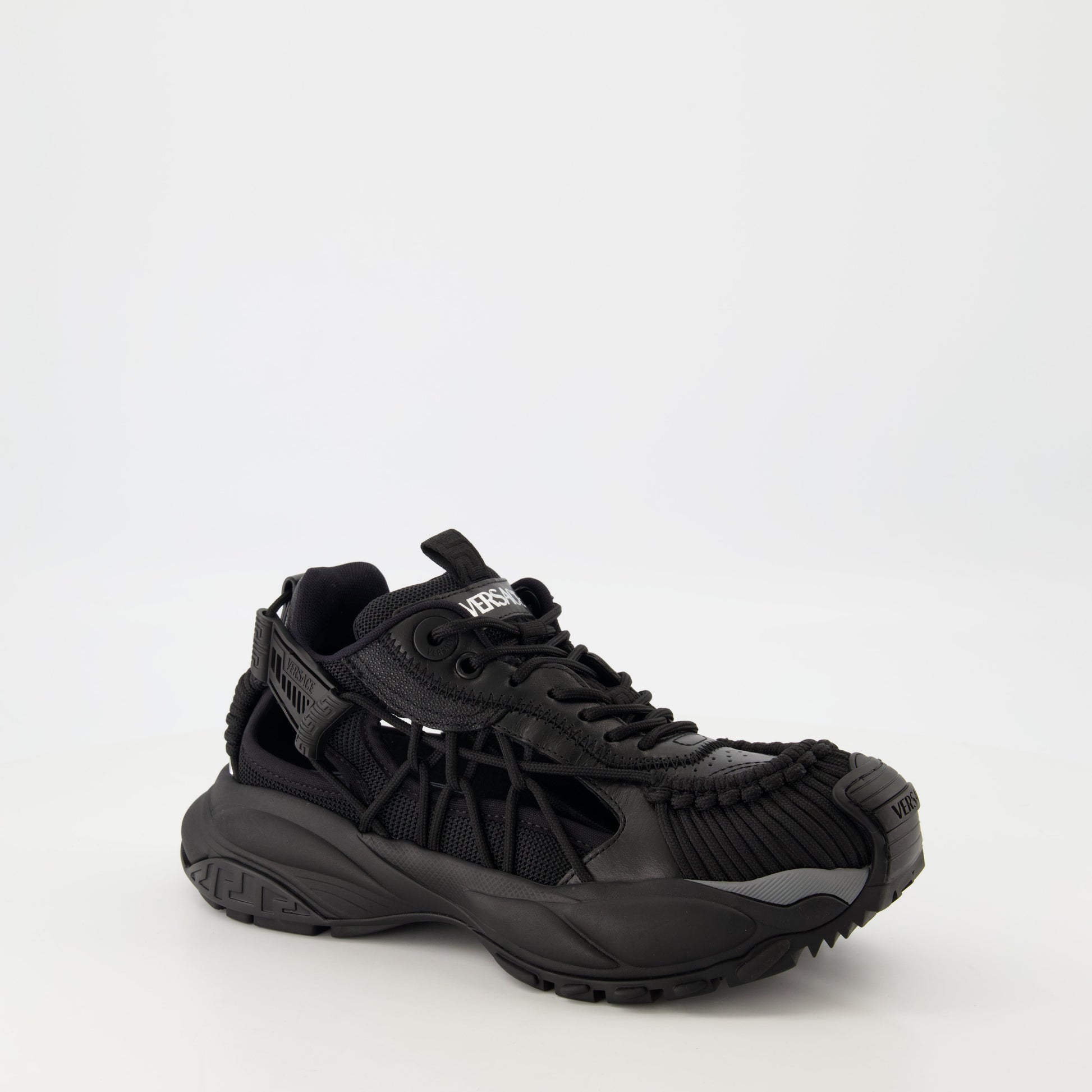 Black Mercury M_VS_01 sneakers by Versace for women, combining polyamide and calf leather. This pair is part of the Spring-Summer 2025 collection with a cut-out design.