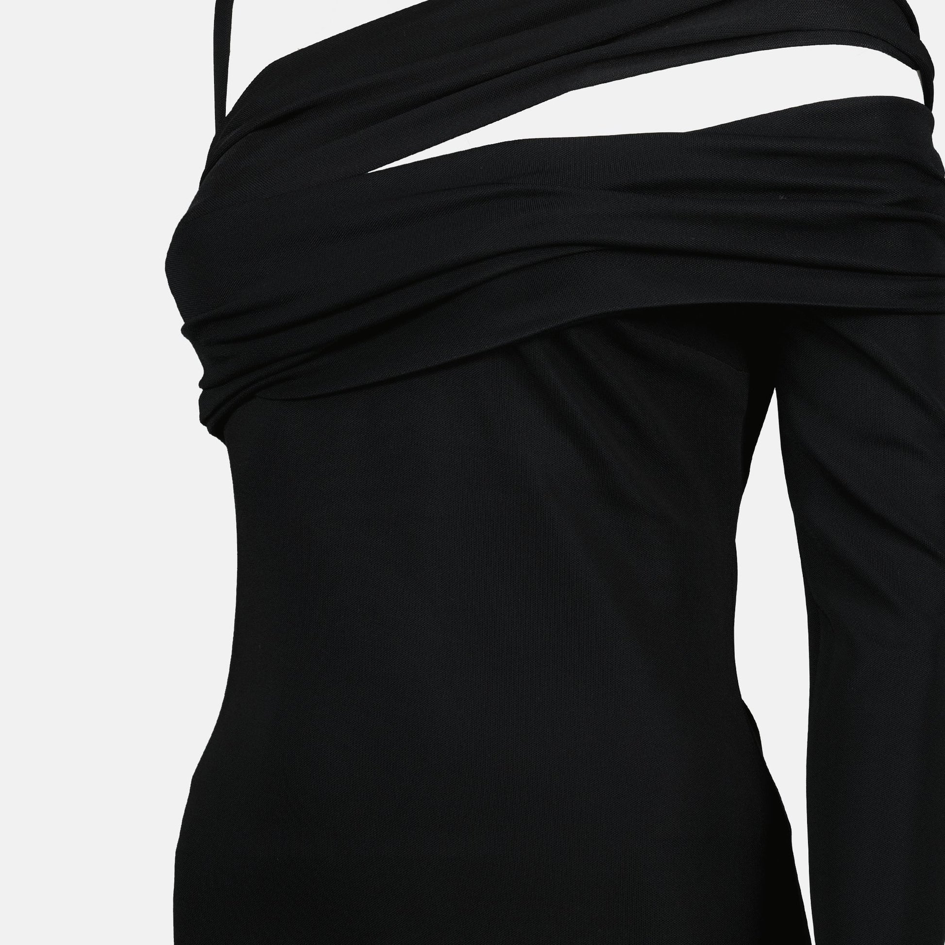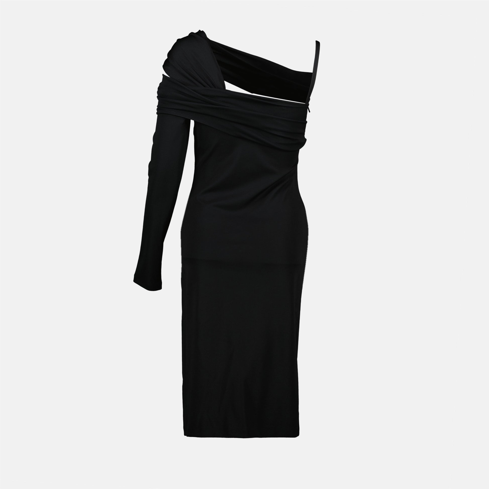Black asymmetrical evening dress from Versace for women, made from viscose and nylon. This piece is part of the Spring-Summer 2025 collection, featuring an asymmetrical design and a unique neckline.