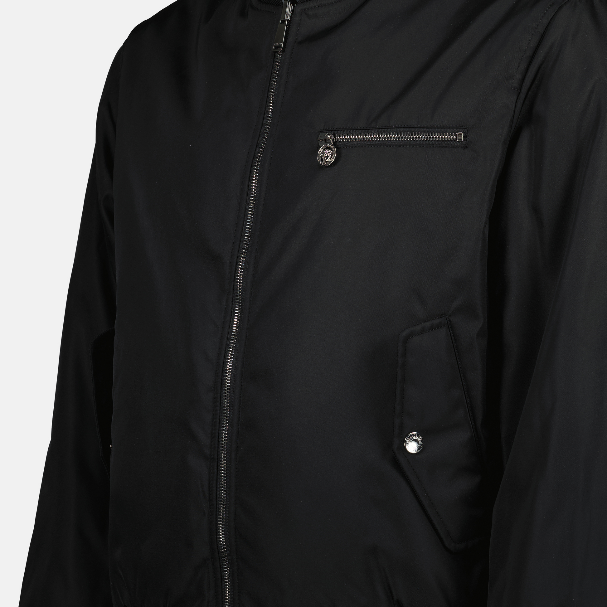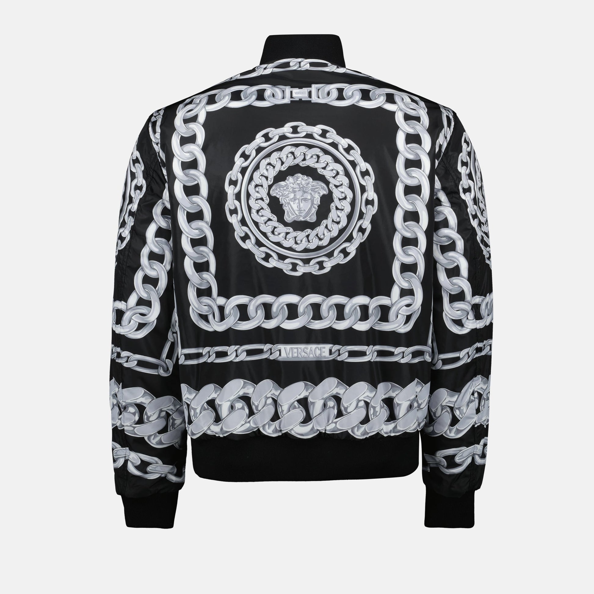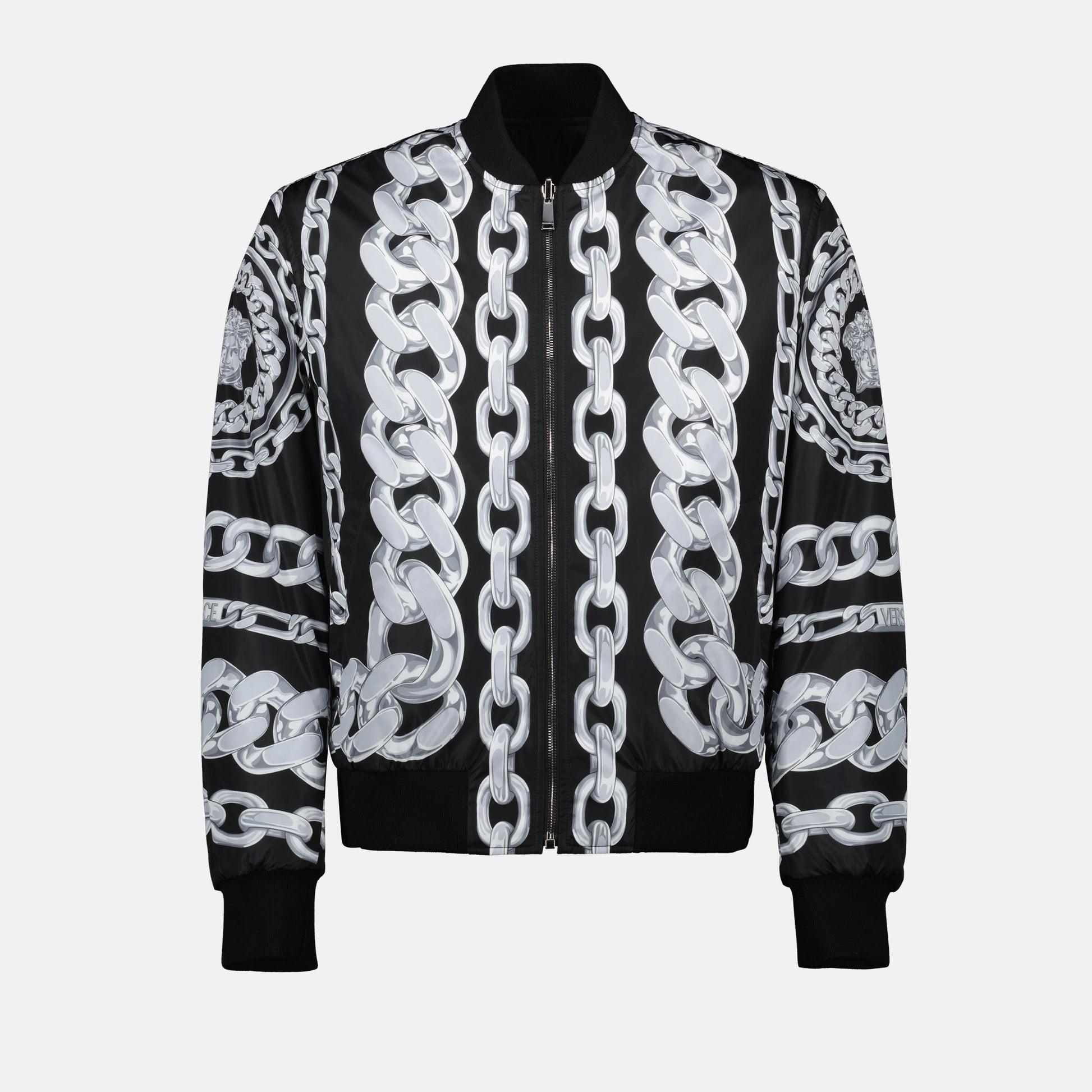 Black reversible bomber jacket from Versace for men from the Spring-Summer 2025 collection. It features a nylon design with a Chain print on one side and a solid black color on the other.