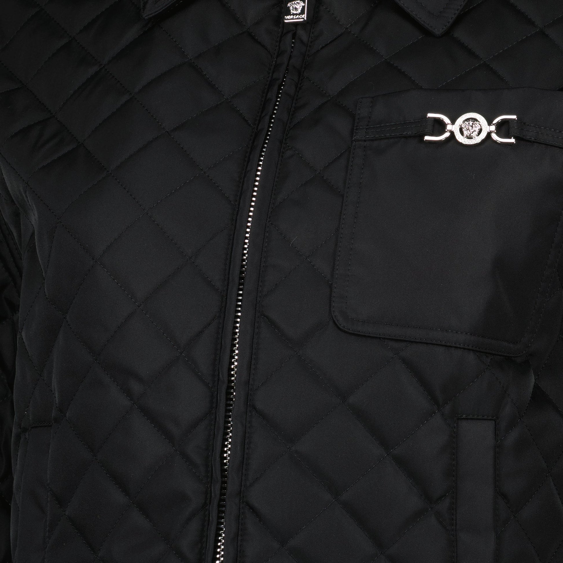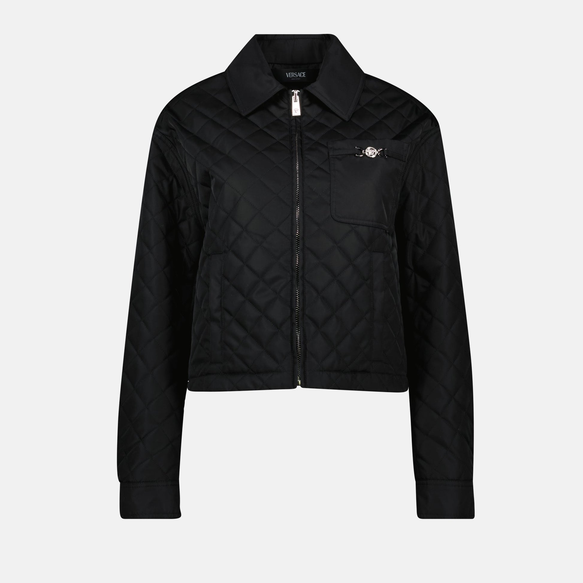 Black diamond quilted jacket from Versace for women, blending elegance and comfort. This piece is part of the Spring-Summer 2025 collection, perfect for a contemporary style.