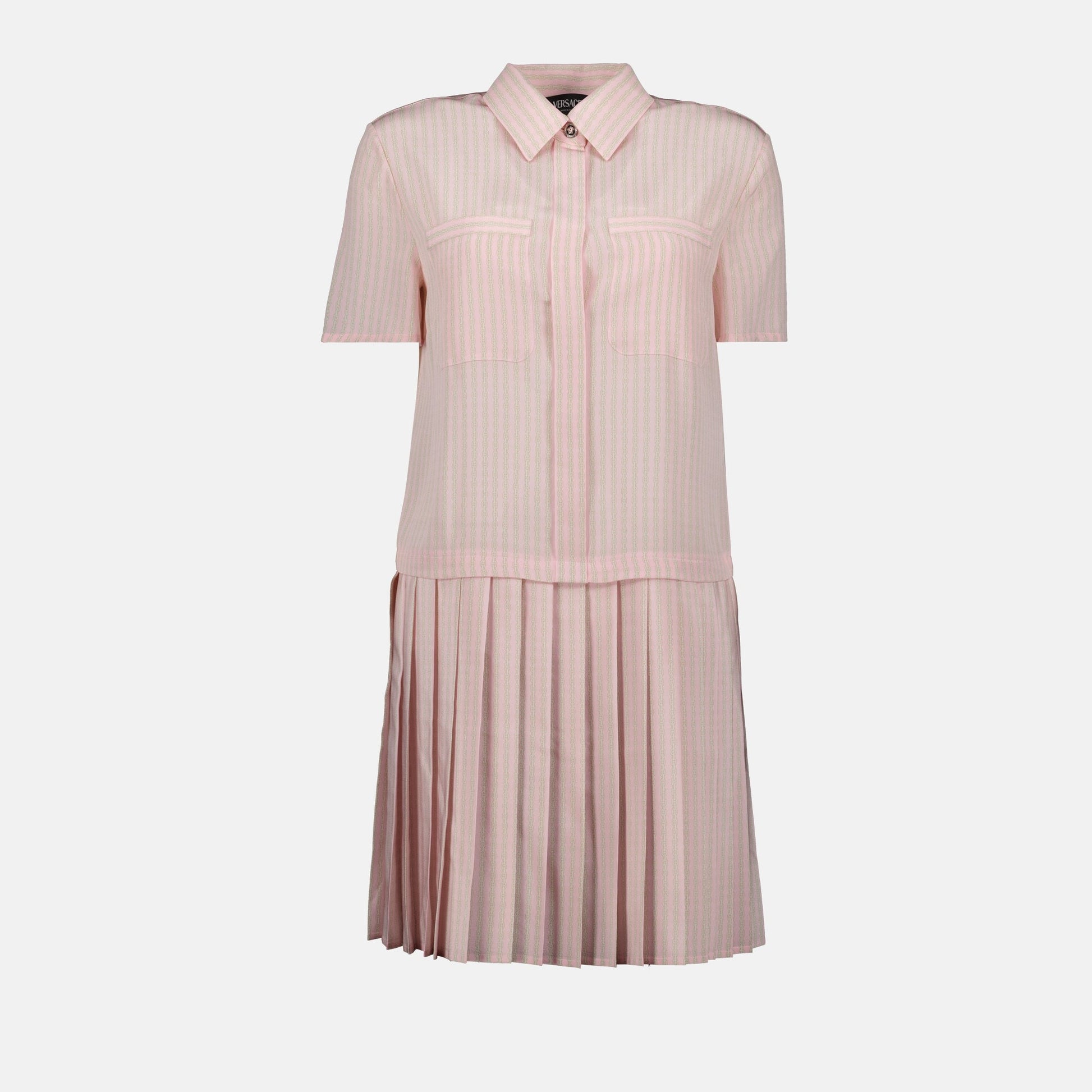 Silk pink shirt dress by Versace for women from the Spring-Summer 2025 collection. It features a classic collar, short sleeves, and a pleated skirt with a Chain stripe print.
