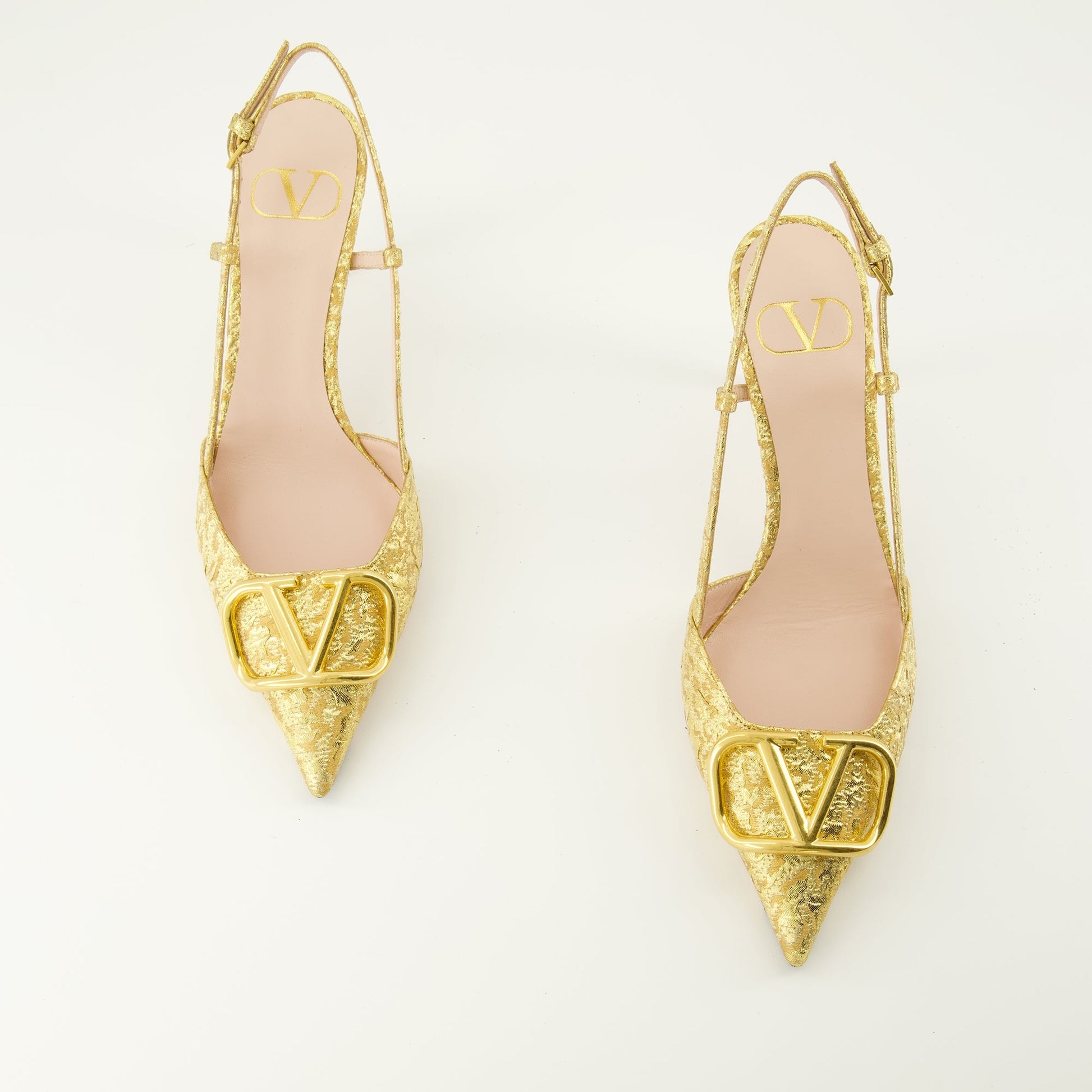 The Vlogo pumps in golden fabric by Valentino Garavani are designed for women. They are part of the Spring-Summer 2026 collection.