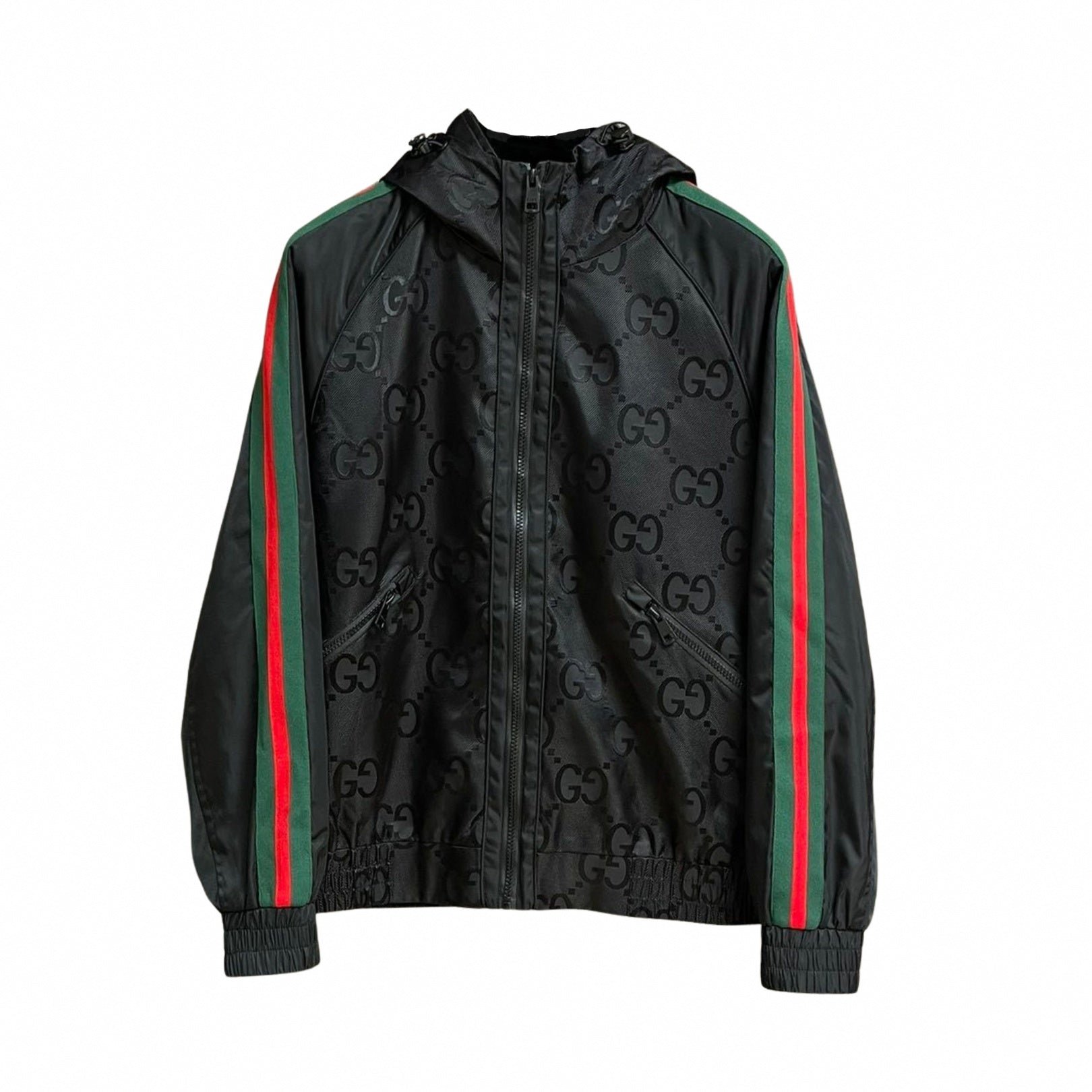 Constructed from lightweight technical nylon, the jacket features a tonal all-over GG pattern that reveals itself when the light hits it—subtle, but unmistakable to those who know. The monochromatic black base is broken up by the legendary green and red Web stripes running down the sleeves, delivering that instant brand recognition. Finished with a protective hood and elasticated trims, it’s built for the streets.